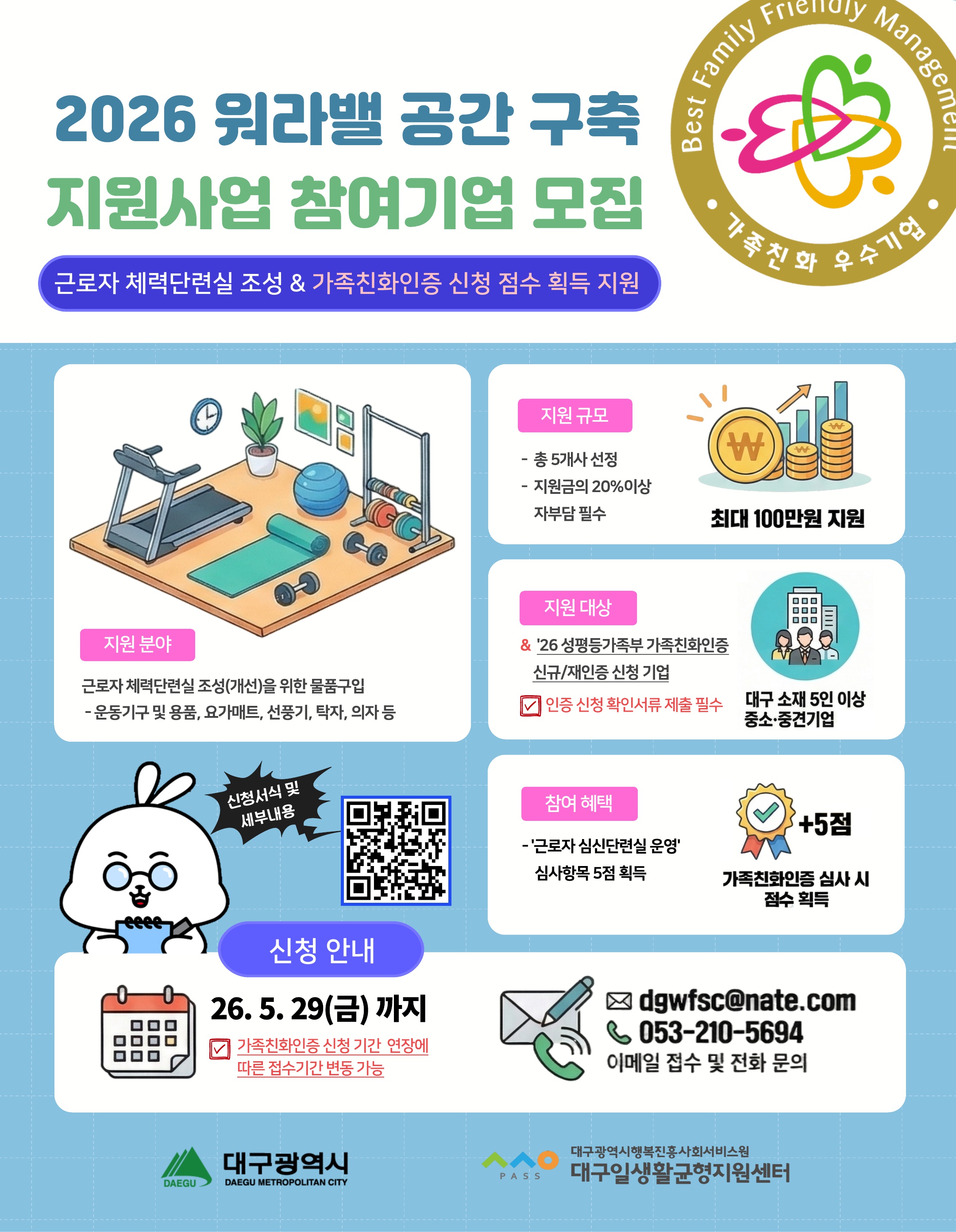 ¢º Áö¿ø³»¿ë : ±Ù·ÎÀÚ Ã¼·Â´Ü·Ã½Ã¼³ Á¶¼º(°³¼±) ¹°Ç° ±¸ÀÔºñ Áö¿ø / 5°³»ç ³»¿Ü / ÃÖ´ë 100¸¸¿ø Áö¿ø