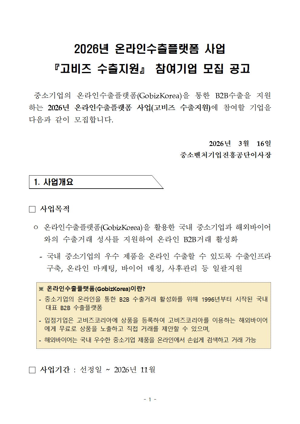 2026³â ¿Â¶óÀμöÃâÇ÷§Æû »ç¾÷ ¡¸°íºñÁî ¼öÃâÁö¿ø¡¹ Âü¿©±â¾÷ ¸ðÁý°ø°í.hwp