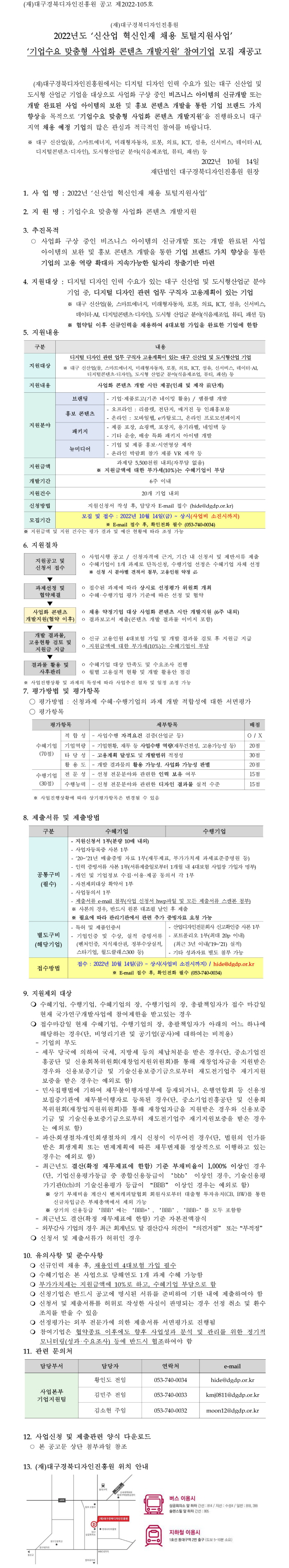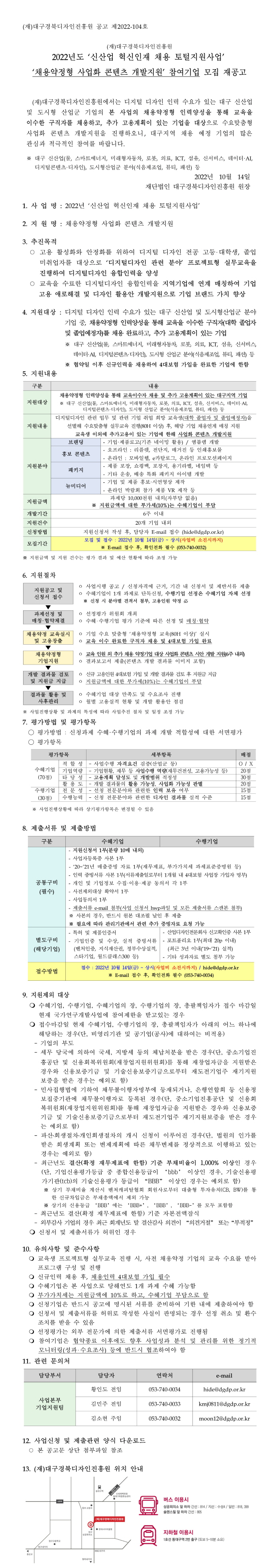 2022³âµµ ½Å»ê¾÷ Çõ½ÅÀÎÀç ä¿ë ÅäÅÐÁö¿ø»ç¾÷ÀÇ 'ä¿ë¾àÁ¤Çü »ç¾÷È ÄÜÅÙÃ÷ °³¹ßÁö¿ø', '±â¾÷¼ö¿ä¸ÂÃãÇü »ç¾÷È ÄÜÅÙÃ÷ °³¹ßÁö¿ø' °úÁ¦ ¸ðÁýÀ» ½ÃÇàÇϰí ÀÖ½À´Ï´Ù.