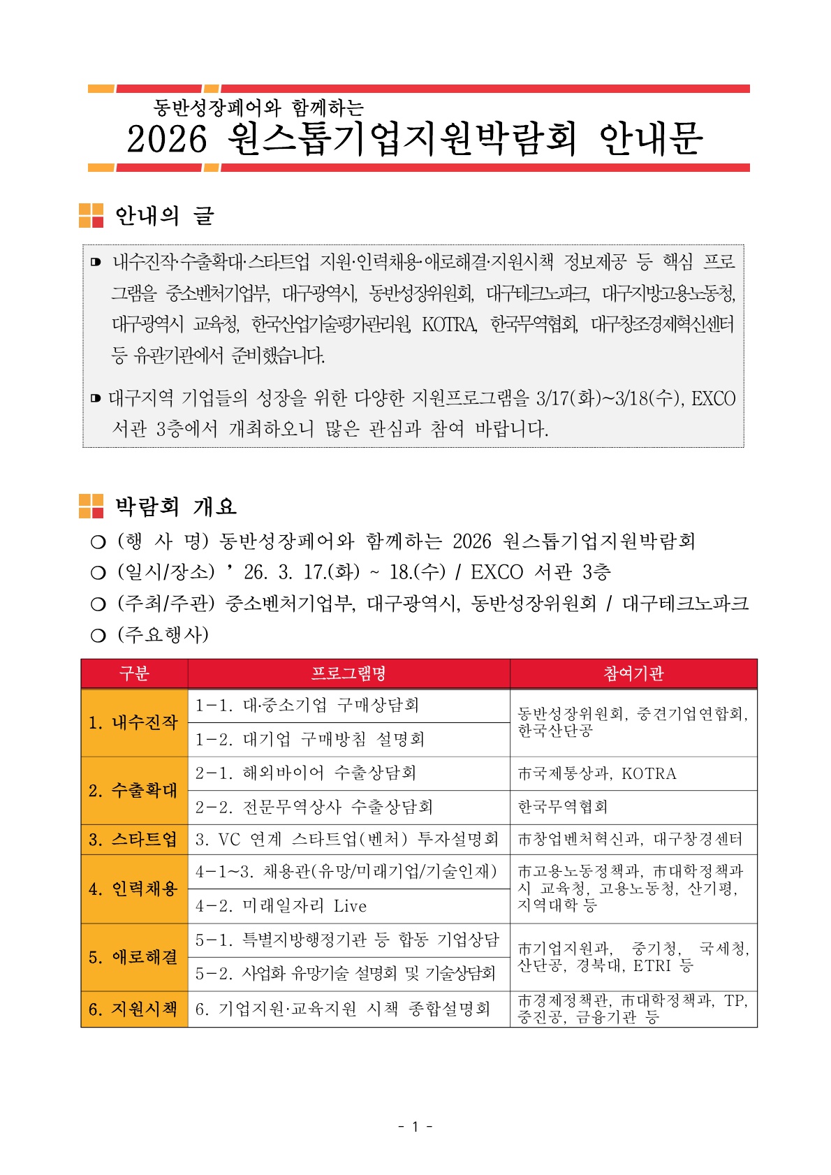 Çà»ç¿¡¼´Â ¡ã´ë¡¤Áß¼Ò±â¾÷ ±¸¸Å»ó´ã ¡ã¼öÃâ»ó´ã ¡ãâ¾÷¡¤½ºÅ¸Æ®¾÷ ÅõÀÚ»ó´ã ¡ã¹Ì·¡±â¾÷ ä¿ë°ü ¡ãÁö¿øÁ¤Ã¥ ¼³¸íȸ ¡ã±â¾÷¾Ö·Î ÇØ°á »ó´ã µî 6´ë ÇÙ½É ±â¾÷Áö¿ø ÇÁ·Î±×·¥À» ¿î¿µÇÒ ¿¹Á¤ÀÔ´Ï´Ù.